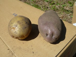 今日は天気が良かったので゛ジャガイモ掘り゛を決行!去年は種芋を買い忘れて作れないというアクシデントがありましたが、今年ははりきって2種類も作ってしまいました。ひとつは「キタアカリ(左)」男爵芋から改良された芋で、誕生して30年経つそうです...たてしな藍といっしょですね!もうひとつは「キタムラサキ(右)」ちょっと変わっていて、ムラサキ色をした芋!味はねっとりとして煮くずれしにくいのが特徴です。さっそく後で試食してみます。