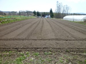 畝作り・マルチ張り・ネット張りがまもなく完成予定!その間にも成長した苗をポットから畑に植替えをしています。