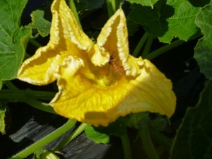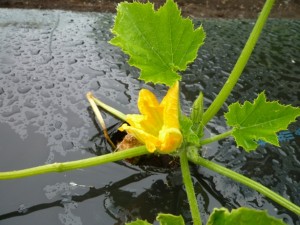 先日、植え替えをした丸ズッキーニが順調に成長して、花を咲かせ始めました。