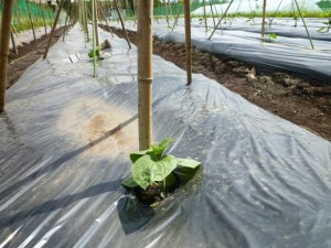 夏野菜も病気にもならずに順調に育ってくれて、モロッコいんげん・トマトなどもうすぐ収穫というところまできています。ちなみに右のスイカは個人的にお遊びで作っているもので、今はまだゴルフボール位の大きさ!真夏に「ひとりスイカ割り」をして食べるのが今の私の目標です。